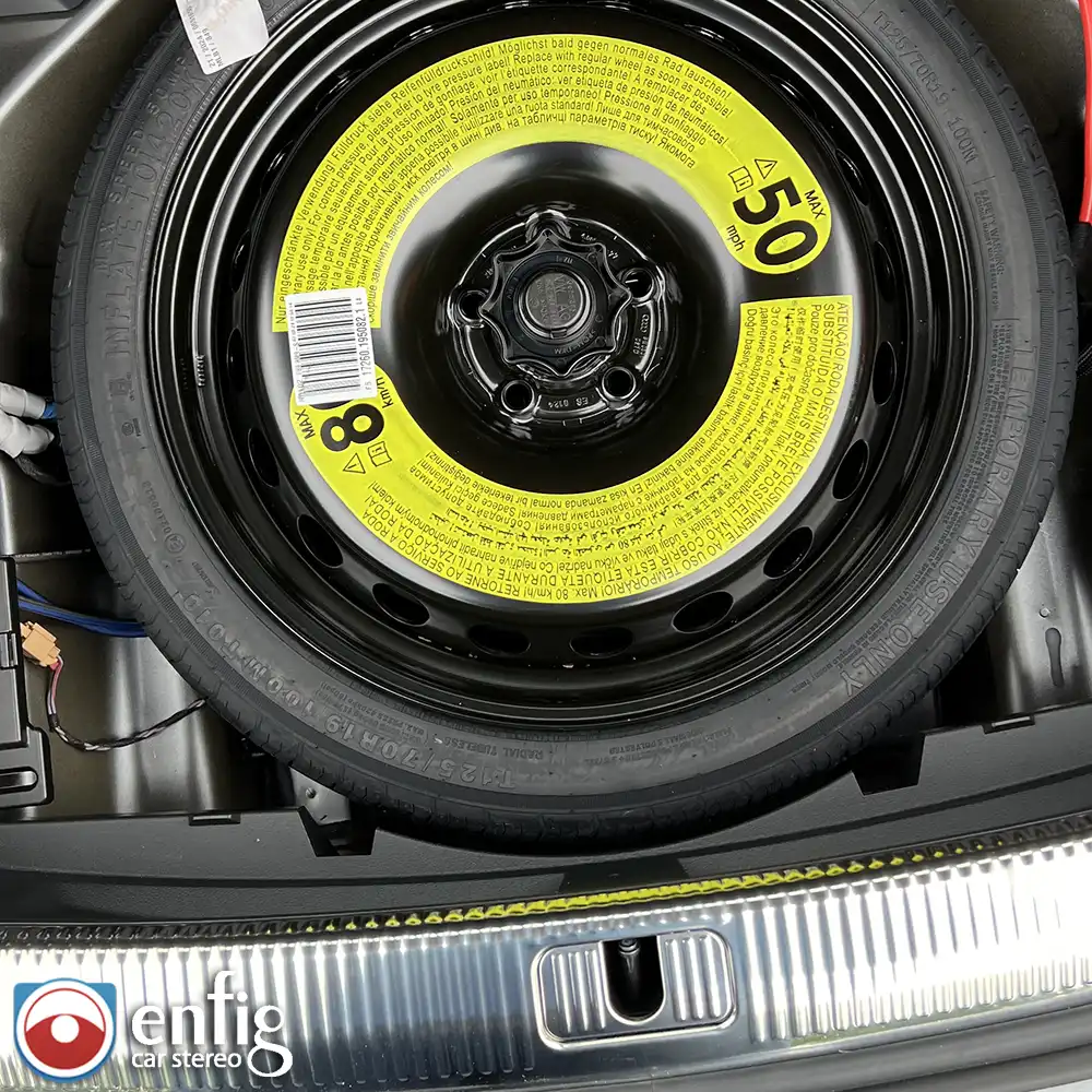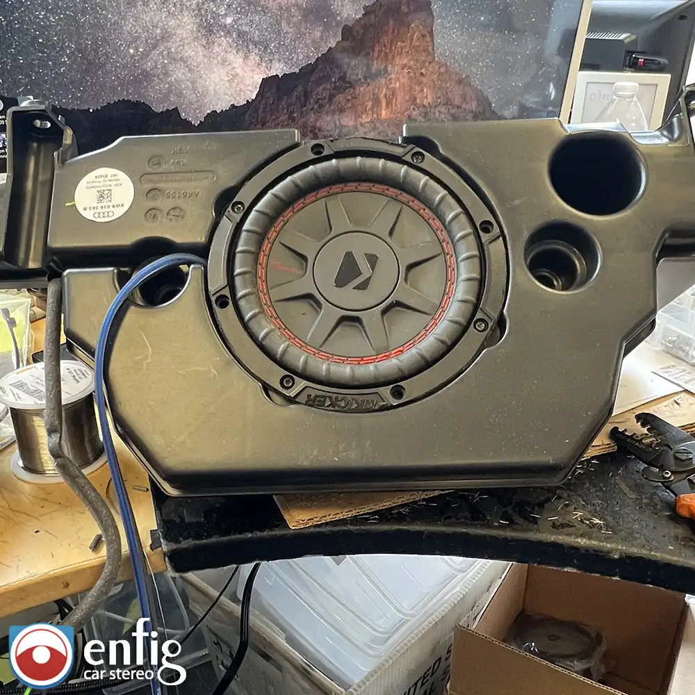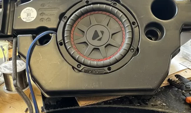 Once the amp was installed Emil asked about putting a sub in the trunk. I recommended that he try a Kicker 6.75″ Sub Powered by a kicker Key 500.1 Mono amplifire that puts out 150W at 4 Ohm. It also has a sound processor with bass restoration. The KEY 5600.1 automatically analyzes the audio being fed into the amplifier. Once this signal has been analyzed, the amp will automatically fix peaks in the signal coming in and restore the low bass that is typically missing to protect the cheap factory sub. In a matter of moments, you get a clean, even bass response from your amp! He was blown away by the bass the little sub puts out and is no longer wants to add a box.