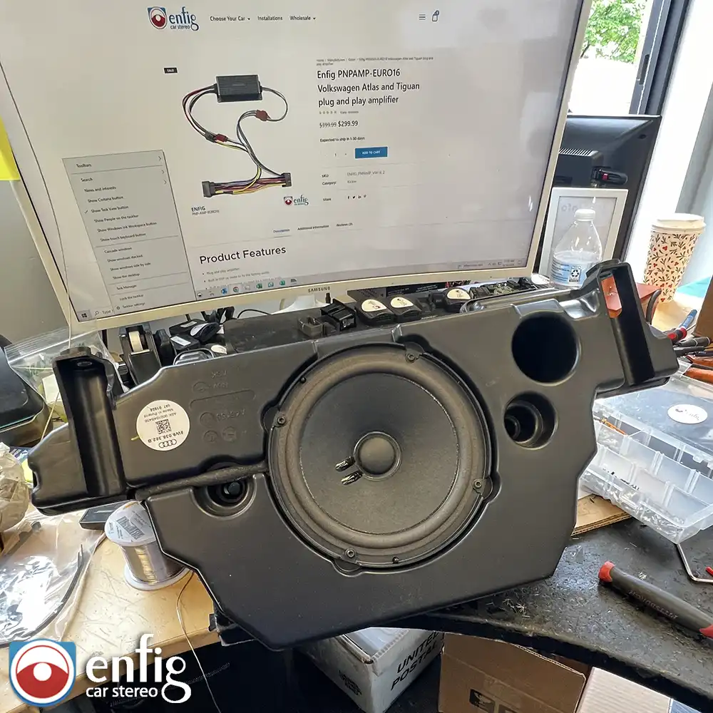 Emil a previous customer came in with his new 2024 Audi S5 with base audio looking for a speaker upgrade. I recommended we install a small plug and play 50×4 Kicker Key 200.4 amplifier. It connects behind the radio receiver in the glove box using are plug and play harness that includes power. Customer couldn’t believe how much the better the amplifier made the factory speakers sound. He’s going to enjoy the new sound for a little while and is coming back at a later date to install new speakers.