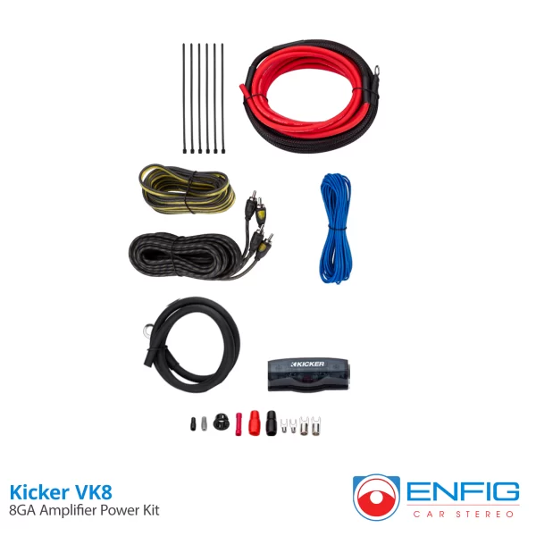 This complete eight-gauge amp kit comes complete with full-spec power and ground wire, speaker wire, interconnect cable, fusing, fuse holder and hardware.